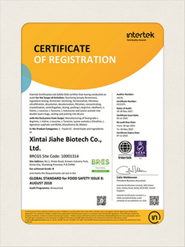 汕頭佳禾生物科技有限公司是一家致力于氨基酸及其衍生物研發、生產和銷售的國家高新技術企業,先后通過了國家藥品GMP認證,ISO9001質量體系認證、ISO14001環境管理體系認證。目前,公司擁有“廣東省專精特新中小企業”、“廣東省氨基酸產品工程技術研究中心”、“汕頭市生物發酵工程技術研究開發中心”、“汕頭市知識產權優勢企業”、“多項國家發明專利”、“廣東省守合同重信用企業”等多項資質和榮譽,旗下“佳禾牌”系列產品已成為原料藥行業知名品牌。 新泰市佳禾生物科技有限公司成立于2012年8月,注冊資金2億元,公司位于山東泰安新泰市新汶工業園區,是國 家級高新技術企業、山東省“專精特新”企業、山東省制造業單項冠軍企業、泰安市科技型中小企業、泰安市農業產業化龍頭企業、中國生物發酵產業協會理事單位。